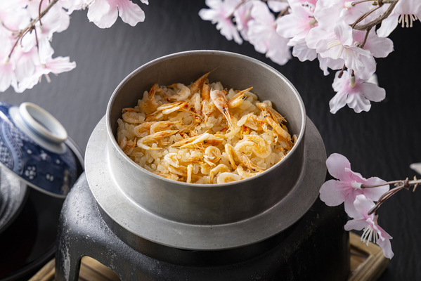 3月は、桜海老とベーコンの釜飯。桜海老の繊細な磯の香りをベーコンのジューシーな脂が引き立てるコク深い味わいをお楽しみください。